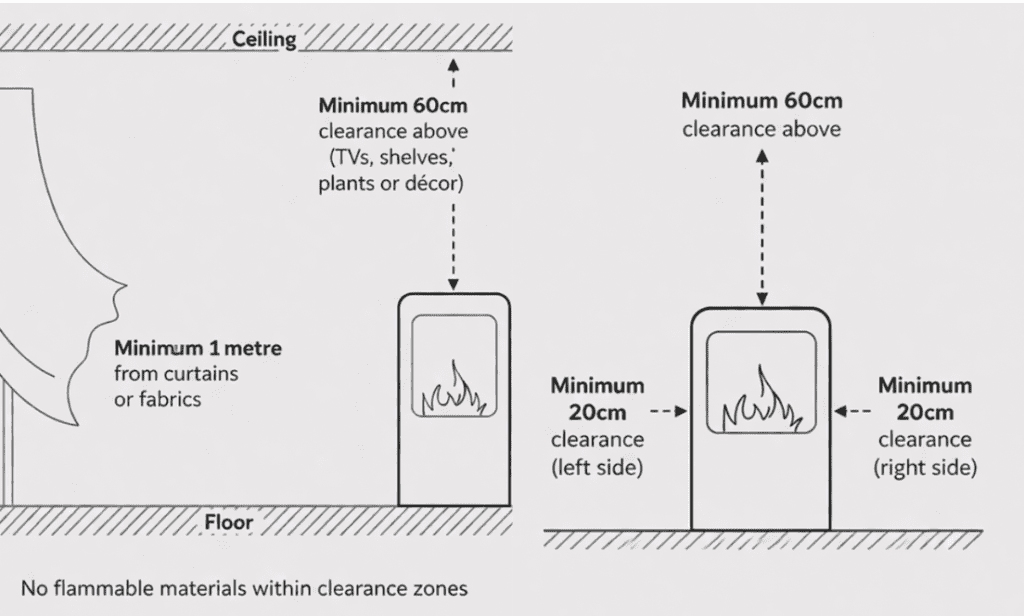 • Minimum 60cm clearance above the fireplace on the wall above the fireplace (such as TVs, shelves, plants, or décor)
